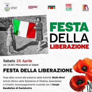 In occasione della Festa della Liberazione, sabato 25 aprile, presso il Monumento ai Caduti, posa della corona alla presenza delle Autorità, Giulia Ricci Istituto Storico della Resistenza di Modena, Associazioni e Cittadini. Accompagnamento musicale con il Corpo Bandistico di Castelvetro